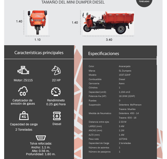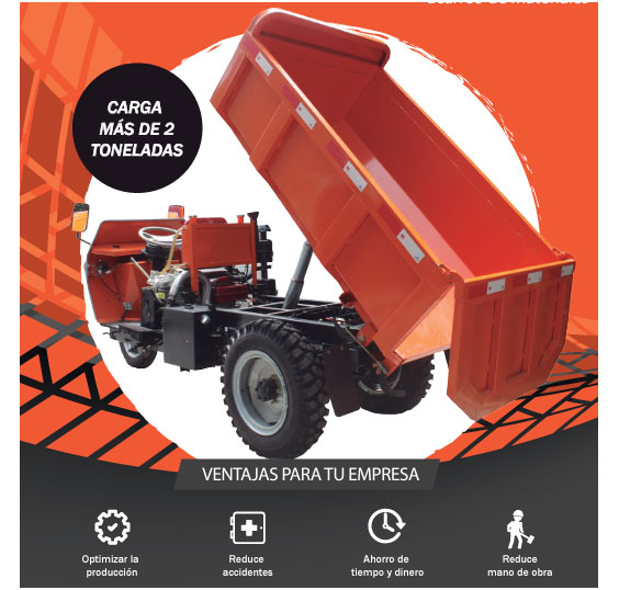 Nuestro Mini Dumper 2T diesel o petrolero optimiza la producción y reduce la mano de obra. Cuenta con luces delanteras, luces traseras, luces direccionales y claxon. Potencia de 22 HP.