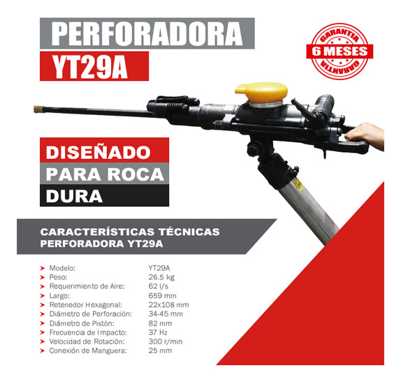 La perforadora modelo YT29A es la máquina indispensable para tus trabajos de perforación. Especialmente diseñada para roca dura de las minas peruanas. Viene con un pie de avance y lubricadora.